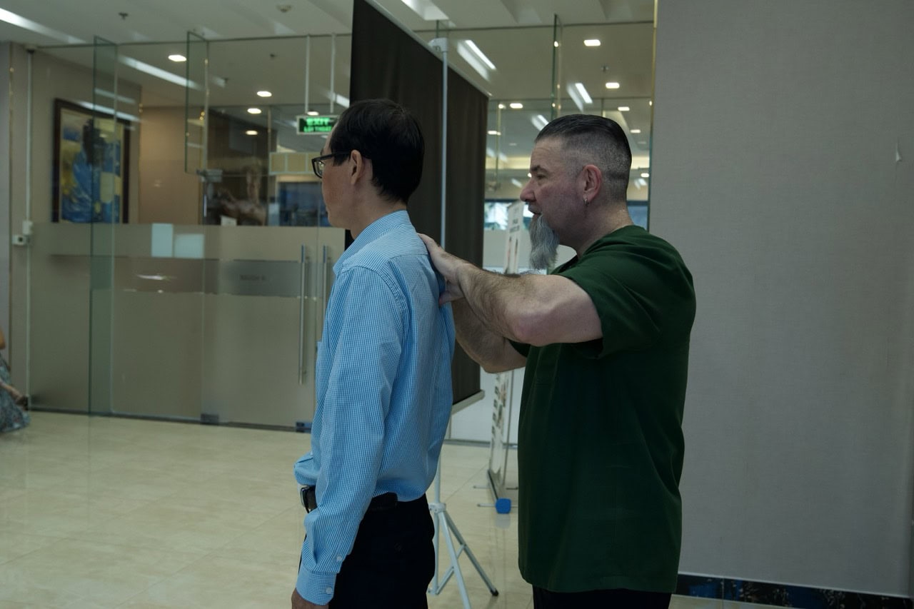 Bên cạnh đó, các bác sĩ cũng hướng dẫn cư dân cách tự kiểm tra tư thế – một hoạt động đơn giản nhưng vô cùng quan trọng để nhận thức sớm về tình trạng cột sống và phòng ngừa rủi ro.
